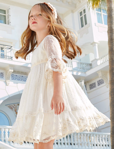 Short sleeved Dress with contrasting details for girl. Round neckline. Opening on the back with an invisible zip. A mix of carefully selected fabrics combined to create a different, unique design. Seams finished up with wave design. Decorative elements: embroidery, decorative contrasting colored strips on the waist.