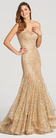 Sleeveless metallic lace, tulle, and two-tone chiffon A-line dress with beaded jewel neckline. Bodice is made of illusion lace with tonal bust cups for coverage, and features lace edged tapered straps that start at the back neck and cross over the shoulder blades to attach to the bodice. The top of the chiffon skirt is edged with lace and drapes over the hips billowing out into a full skirt with sweep train.